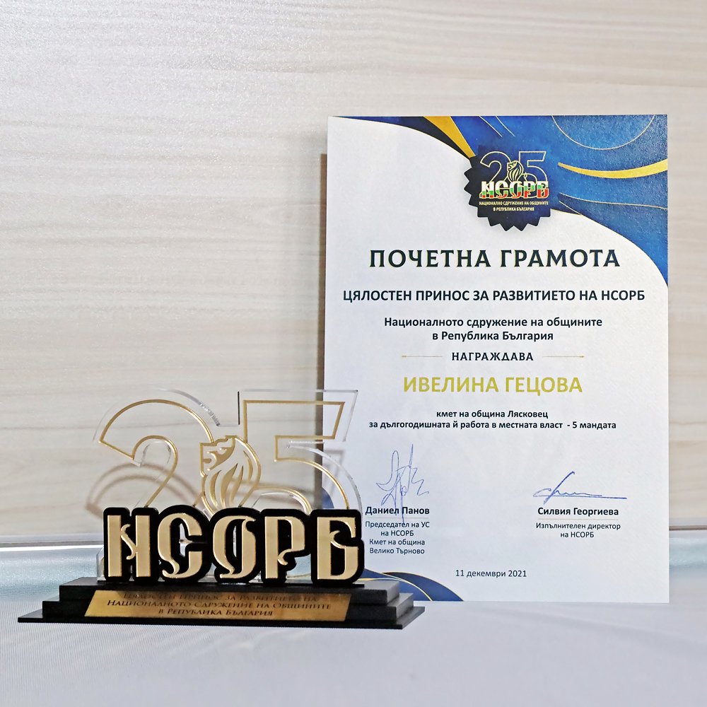 Кметът на община Лясковец д-р Ивелина Гецова получи Почетна грамота от Националното сдружение на общините в Република България, поздравителен адрес и награда плакет за цялостен принос за развитието на Сдружението. Във връзка с тържественото отбелязване на 25-та годишнина от учредяване на организацията, бяха връчени юбилейни награди в четири категории – на председателите на Управителните и контролните съвети, на дългогодишните членове на ръководните и контролни органи, на партньорските организации, подкрепяли през годините институционалното развитие и на кметовете и председателите на общинските съвети с над четири мандата. Д-р Гецова получи отличието за всеотдайната си дългогодишна работа в местната власт през петте си мандата на управление.