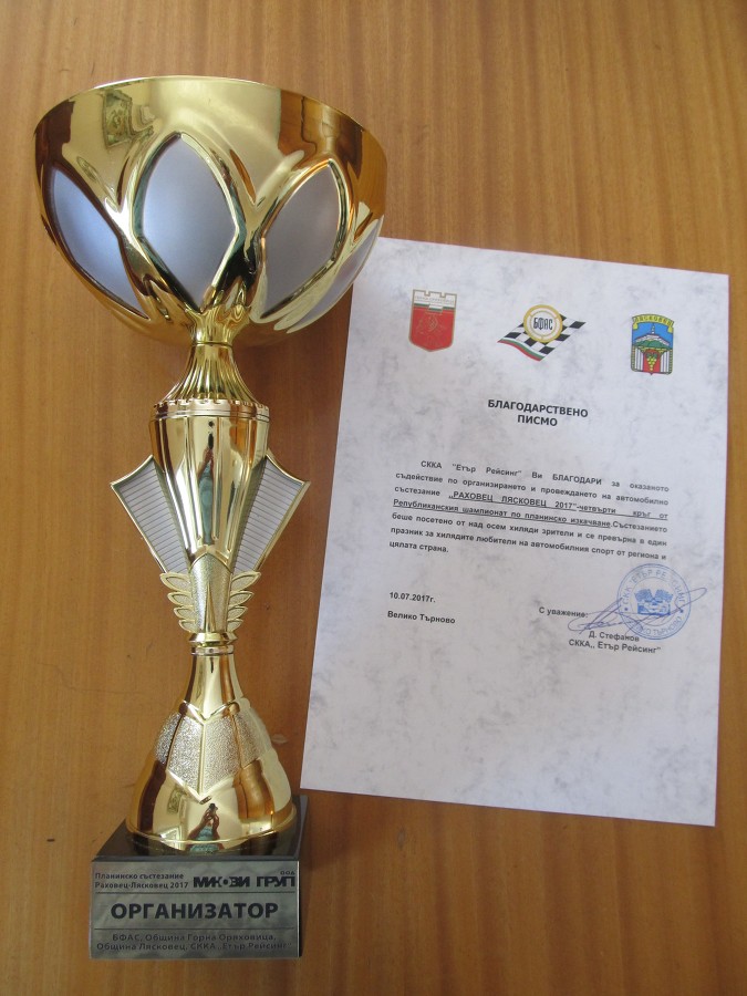 В знак на благодарност за добрата организация на поредната пета автомобилна надпревара в нашия град, кметът д-р Гецова получи от директора на състезанието Купа-Организатор и благодарствено писмо. Автомобилното състезание „Лясковец-Раховец” тази година се проведе за пети пореден път на територията на град Лясковец. Ръководството на Общината изцяло се погрижи добре да подготви трасето за безопасното преминаване на състезателите по него. В резултат на отличното сътрудничество на Община Лясковец със СККА „Етър Рейсинг” и другите организатори - съседната ни Община Горна Оряховица и Българската Федерация по автомобилен спорт, тази година състезанието отново беше на много високо ниво, успя да събере над осем хиляди почитатели и любители на този екстремен спорт и породи емоции у всички гости на Лясковец, дошли за зрелищното събитие.