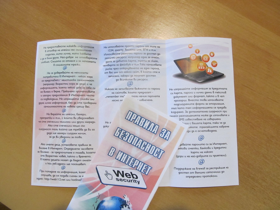 На срещата бяха раздадени на младежите и брошури, в които подробно са представени Правила за безопасен интернет. Материалите запознаха осмокласниците как да се действа и към кого да се обърнат за помощ, в случаите на интернет престъпления. В контекста на това, че интернет пространството е един от основните механизми за въвличане в трафик на хора, беше прожектиран и видеоматериал на Европол и ГДБОП, отразяващ действителен случай за трафик на хора чрез интернет запознанства.