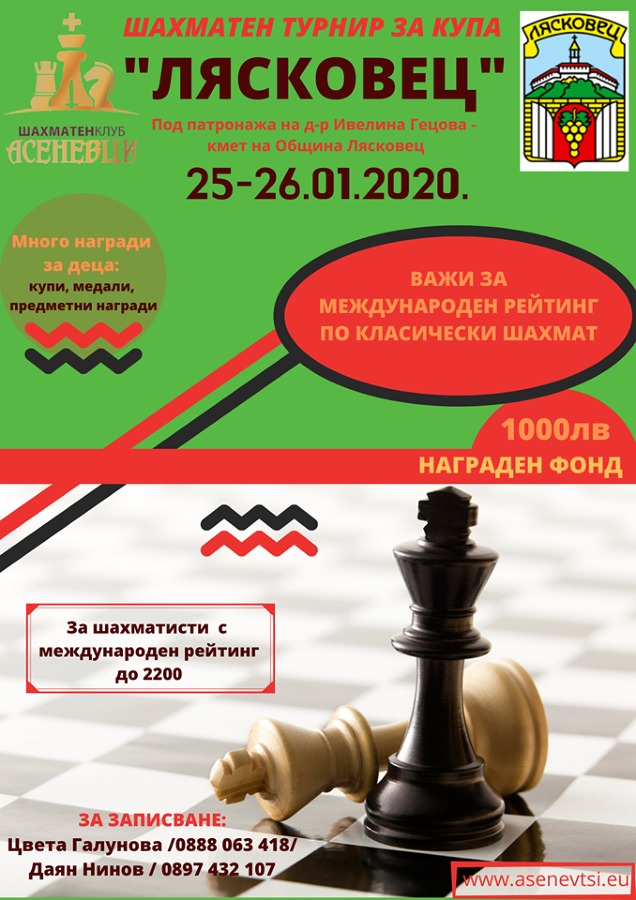 За трета поредна година ще се проведе шахматен турнир за Купа „Лясковец”. Турнирът вече се превърна в традиция за града ни и протича под патронажа на кмета на Община Лясковец д-р Ивелина Гецова. Тази година той ще се проведе на 25 и 26 януари, като съревнованието ще бъде в комплекс „Лесопарка”.