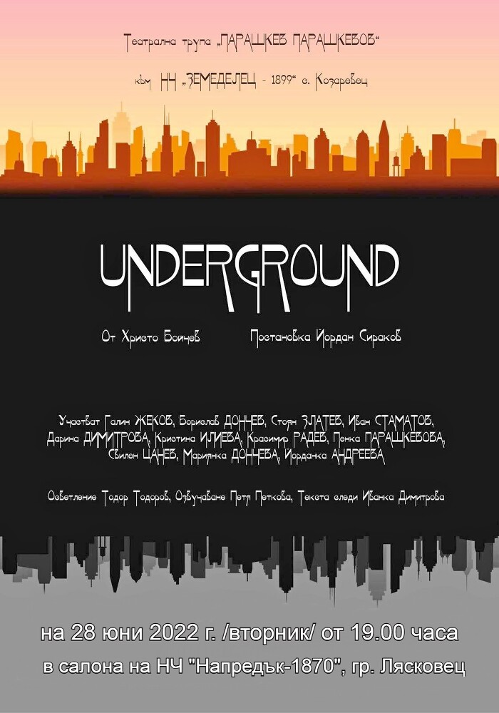 „Ъндърграунд“ е новото заглавие в творчески сезон 2021-2022 година на Театрална трупа „П. Парашкевов“ към НЧ „Земеделец-1899“ с. Козаревец. Талантливият Йордан Сираков създава от текста на Христо Бойчев вълшебство. „Ъндърграунд” е една нова модерна пиеса, каквато актьорите ни не са поставяли до сега – паралел между два свята, пълни с човешки недостатъци. Авторът Христо Бойчев се шегува умело с всички тези недостатъци – сребролюбие, завист, равнодушие, кариеризъм, дори и със...смъртта.