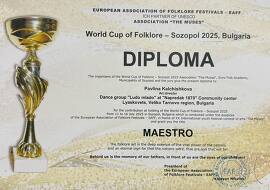 Специални поздравления от кмета Васил Христов в началото на новата година получи ръководителят на лясковското „Лудо младо“ Павлина Кълчишкова. Кметът ѝ връчи поздравителен адрес от свое име и лично предаде Диплома от председателя на Европейската асоциация на фолклорните фестивали Калоян Николов. С Диплома нашият художествен ръководител бе удостоен със званието „Маестро“ заради заслугите ѝ през 2025 година и постигнатите високи резултати на международния шампионат по фолклор. Тази година „Лудо младо“ спечелиха най-голямата награда на Международния форум - Купа „Гран при“ за цялостно представяне и редица още награди по категории и възрастови групи. Освен златен медал в категория „Фолклорни танци – модерна хореография“, съставът получи и Диплом и ваучер на стойност 500 евро за участие в Световния шампионат по фолклор „World Folk“ 2025. Наградата на Община Созопол бе връчена пък на корепетитора Иван Кълчишков за съществен принос в опазването и развитието на световните традиционни изкуства. С успеха на „Лудо младо“ Лясковец зае своето заслужено място сред световните културни центрове и нареди България на международната сцена.