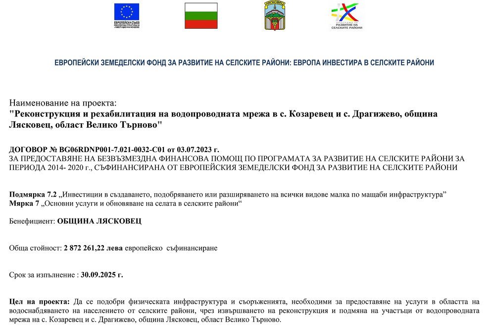 Бюджетна линия: BG06RDNP001-7.021 Основни дейности по проекта: Състоянието на съществуващата водопроводна мрежа в с. Козаревец и с. Драгижево, община Лясковец е изключително остаряла и амортизирана, което причинява големи физически загуби на вода от течове, честите аварии затрудняват нормалното водоподаване и от друга страна са свързани със значителни разходи за изкопаване на уличните платна и в следствие на което за възстановяване пътната/ите настилка/и. С оглед на съществуващото състояние на водопроводната мрежа е наложителна подмяна поради факта, че съществуващите мрежи са изградени от етернитови, азбестоциментови и чугунени тръби, които са амортизирани и дават много аварии, прекъсване на водоподаването, влошаване качеството на водата, разкопаване на улици, сградните водопроводни отклонения към прилежащите имоти са от поцинковани или черни стоманени тръби, които са на повече от 50 години. Експлоатационното състояние на водопроводните клонове се харектиризира с чести аварии, вследствие корозия в стоманените части, срязване след подмиване на земната основа в азбестоциментовите тръби, компрометиране на връзки вследствие на умора и вертикални размествания в резултат на първични течове и динамично транспортно натоварване. Подмяната на съществуващата водопроводна мрежа с нова от своя страна ще доведе до намаляване на авариите и загубите на вода. В процеса на изпълнение на проект „Реконструкция и рехабилитация на вътрешна водопроводна мрежа в с. Козаревец и с. Драгижево, община Лясковец, област Велико Търново“ се предвижда изпълнение на строително-монтажни работи (СМР) на база на изготвени инвестиционни проекти във фаза „работна“ за всяко населено място. В процеса на изпълнение на строителство се предвижда да бъде извършено следното: - реконструкция и рехабилитация на водопроводна мрежа в с. Козаревец, с дължина 2738,07 м. и 105 бр. сградни отклонения; - реконструкция и рехабилитация на водопроводна мрежа в с. Драгижево, с дължина 5 241,26 м. и 336 бр. сградни отклонения; - положени нови полиетиленови тръби Ф90 - 2 405,52 м. и Ф110 - 374,55 м.с висока плътност на участъци от водопроводната мрежа на с. Козаревец, общ. Лясковец; - положени нови полиетиленови тръби Ф90 - 3471,21 м., Ф110 - 1061,32 м., Ф140 - 481,57 м. и Ф160 - 287,16 м. с висока плътност на участъци от водопроводната мрежа на с. Драгижево, общ. Лясковец; - 690,91 кв.м. възстановена асфалтова настилка в с. Козаревец, общ. Лясковец; - 2178,64 кв.м. възстановена асфалтова настилка в с. Драгижево, общ. Лясковец; - възстановени 394 м. бордюри в с. Драгижево и 36 м. бордюри в с. Козаревец; - възстановени 394 кв.м. тротоарни настилки в с. Драгижево и 36 кв.м. тротоарни настилки в с. Козаревец; - монтирани 30 бр. надземни пожарни хидранта ПХ 70/80 в с. Драгижево и 21 бр. надземни пожарни хидранта ПХ 70/80; - подобряване основните показатели за качество на водоснабдителните услугите в Община Лясковец; - изграждането на надеждна и отговаряща на съвременните изисквания водоснабдителна система. Период на изпълнение: 03.07.2023 - 30.09.2025 г. Обща стойност на проекта: 2 872 261.22 лева